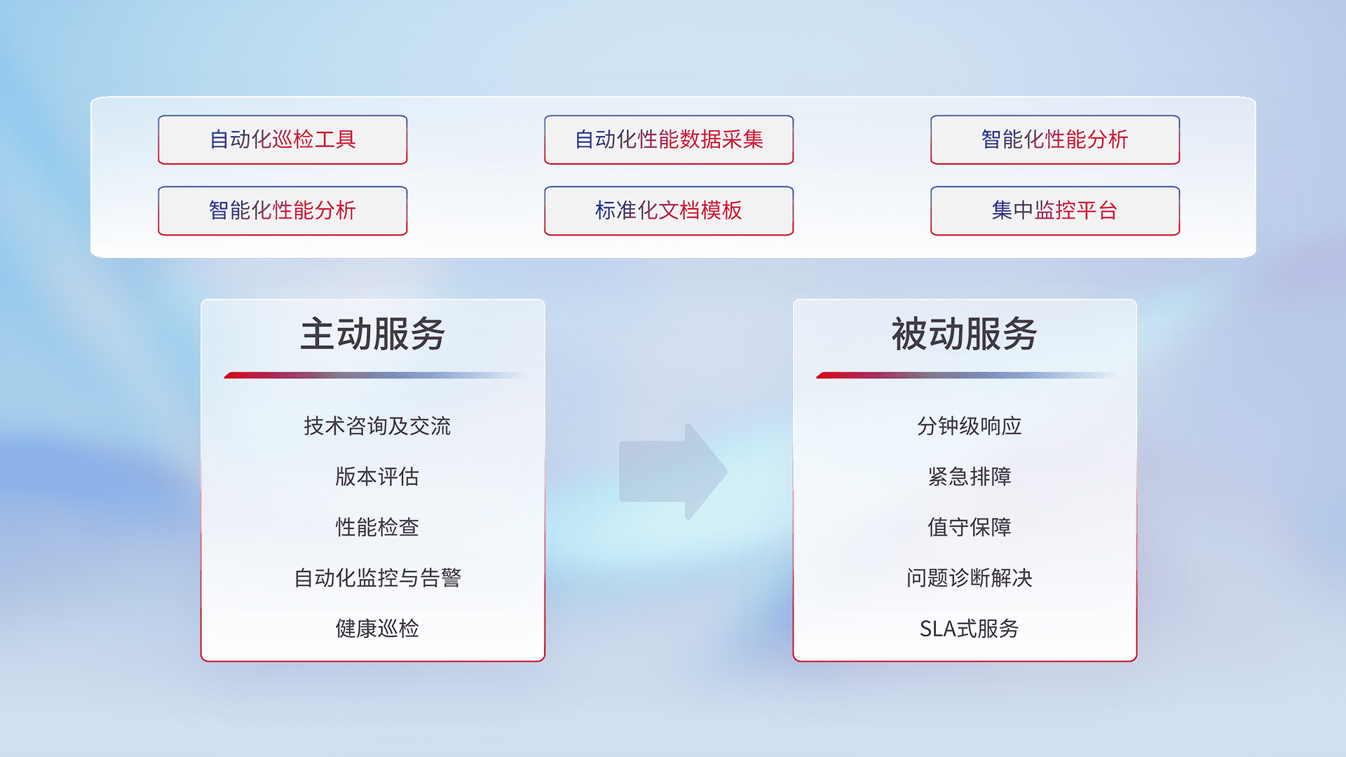 智能化工具和标准化文档,,保障服务质量,,,提供主动服务(包含技术咨询、、、、版本评估、、、性能检查、、自动化监控与告警、、、健康巡检)和被动服务包含(分钟级响应、、紧急排障、、值守保障、、、、问题诊断解决、、、SLA服务)。。。